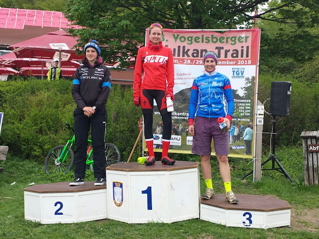 An der Startlinie verdeutlichte uns der Sprecher noch einmal die Daten: 12 Kilometer, 550 Höhenmeter, mit einer kurzen und steilen Abfahrt. Dann ertönte der Startschuss und das Feld knallte ebenso los. Der Start war hart, ich versuchte einfach an der Führungsgruppe zu bleiben. Wie immer – pacing wird ja überbewertet. ;-) Es gelang mir dann ganz gut in das Rennen zu finden und das Tempo gleichmäßig zu halten. Mein treuer Wattmesser verriet mir, dass ich dieses Tempo auch durchfahren kann. Ich wagte keinen Blick zurück, sondern konzentrierte mich ganz auf mein Rennen. 5 Kilometer vor dem Ziel teilte ein Streckenposten mit, dass nur 9 Fahrer vor mir waren. Diese Position wollte ich dann gerne halten. Kurz vor dem Ziel holperte es dann ordentlich durch eine Schotterpassage, deren Steine so groß und frisch waren, als wären sie extra als Schikane hingeschüttet worden. Bei jeden Tritt flogen die Steine und ich hoffte nur inständig, dass ich nicht platt fuhr. Auch in der folgenden Wurzelpassage hoffte ich weiter auf ein pannenfreies Durchkommen (der platte Reifen letztes Wochenende hat doch seine Ängste hinterlassen). Dann folgte ein langer Wieseaufstieg und schon kam der Zielbogen in Sicht. Ich überquerte als erste Frau mit 4 Minuten Vorsprung auf die nächste Dame die Ziellinie und nur 9 Männer waren schneller. Da freute ich mich sehr. Das Rennen lief super und ich bin sehr zufrieden, dass ich meine Leistung konstant durchfahren konnte. Bergzeitfahren liegt mir irgendwie ganz gut. ;-)